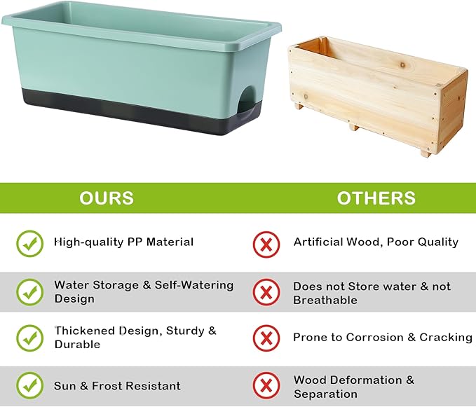 • 【Premium & Durable】The planter pots are made of high quality PP material and has been thickened to bear up to 300KG (660LB). This window box planter is sturdy, wear-resistant and durable. It can be exposed to light, wind, and sunlight for long periods of time, with a lifespan of decades. It is an excellent planter box for both indoor and outdoor.