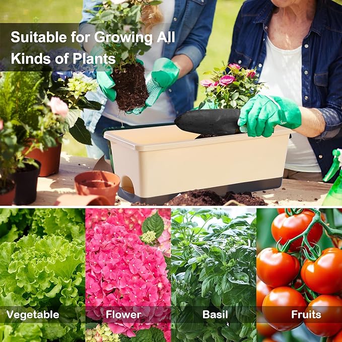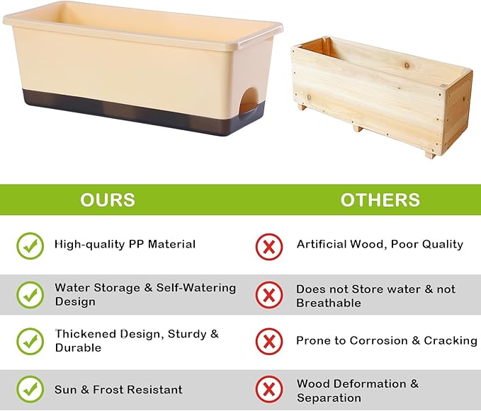 • 【Premium & Durable】The planter pots are made of high quality PP material and has been thickened to bear up to 300KG (660LB). This window box planter is sturdy, wear-resistant and durable. It can be exposed to light, wind, and sunlight for long periods of time, with a lifespan of decades. It is an excellent planter box for both indoor and outdoor.