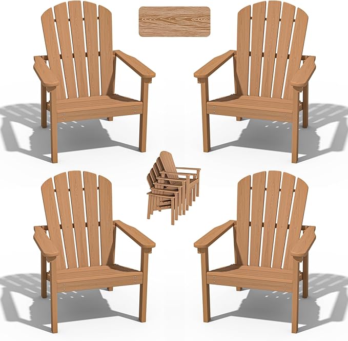 Stackable Adirondack Chair Set of 4, HDPE Outdoor Patio Chair - Durable and Space Saving, Suitable for Porches, Lawns or Garden, Teak