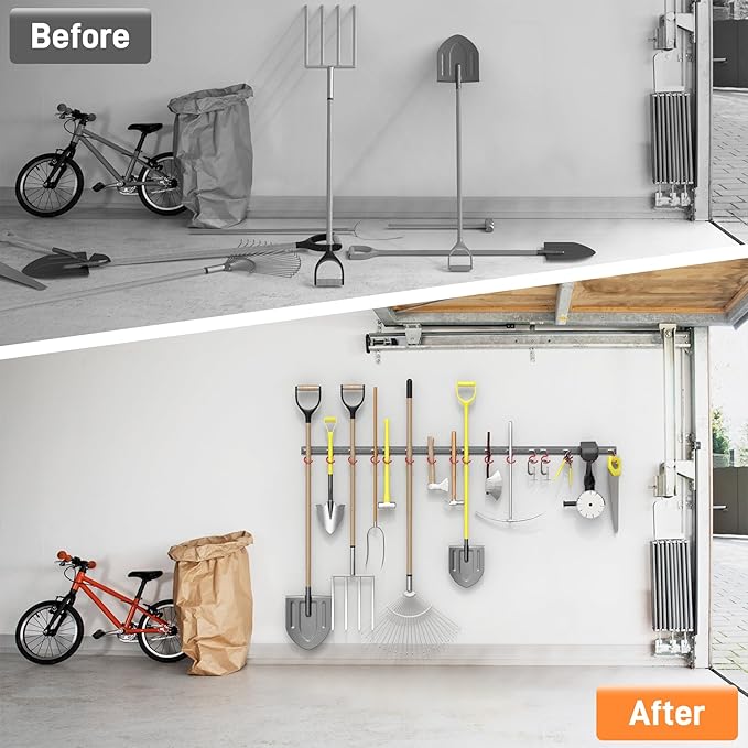 • Wall-Mounted Tool Organizer: Declutter your garage, shed with this sleek, all-metal tool rack. Perfect for storing tools like rakes, shovels, brooms, mops and more in a neat, wall-mounted setup