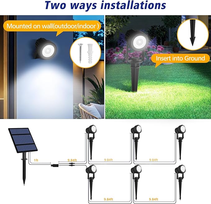 • 2 Installation Methods & 270° Adjustable: The solar panel and outdoor solar landscape lights can be installed in the ground or mounted on the wall with included screws. 270° adjustable light ensures illuminating your garden or yard perfectly and adjustable solar panel to get optimum sun exposure