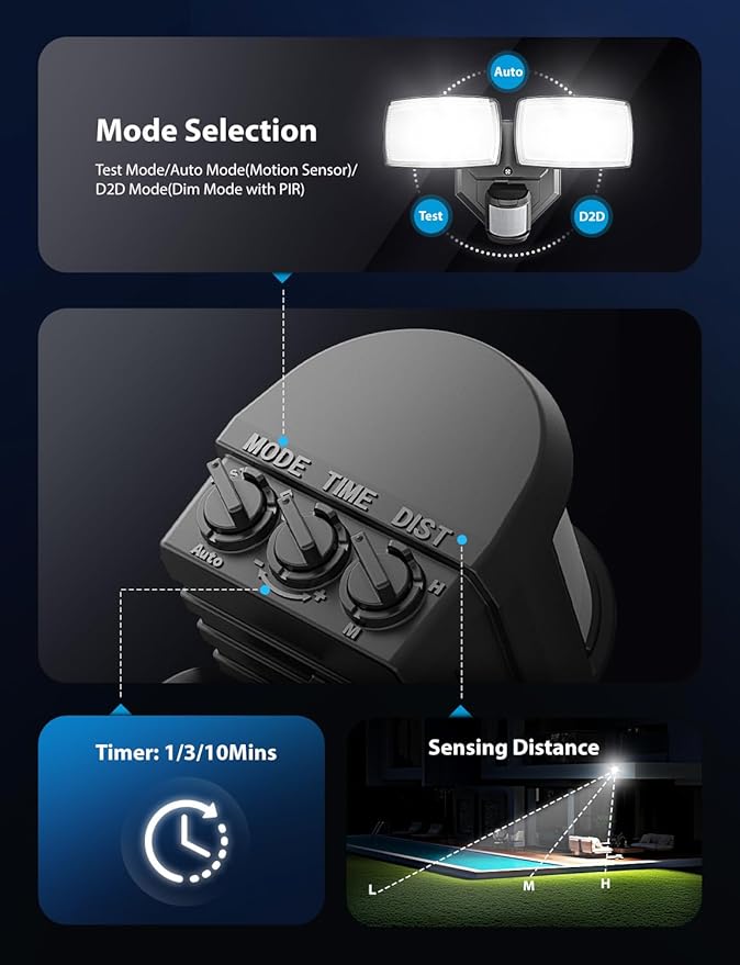 • Dusk to Dawn Mode: Equipped with the Dusk to Dawn function, this motion flood lights outdoor automatically turn off during the day and operate at 30% brightness at night. When motion is detected, they instantly brighten to 100%, ensuring energy efficiency and enhanced security.