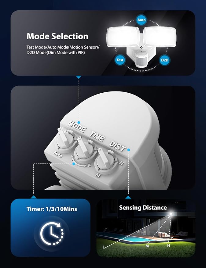 • Dusk to Dawn Mode: Equipped with the Dusk to Dawn function, this motion flood lights outdoor automatically turn off during the day and operate at 30% brightness at night. When motion is detected, they instantly brighten to 100%, ensuring energy efficiency and enhanced security.
