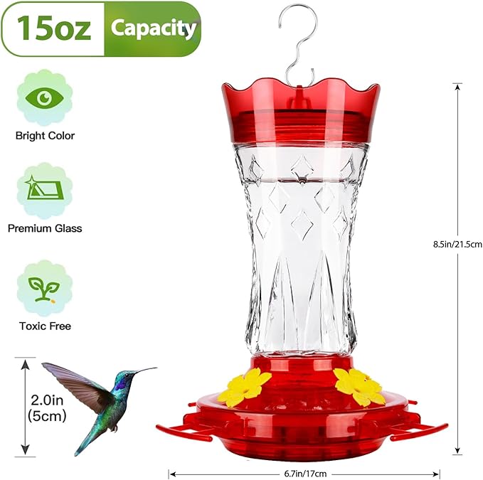 • Stylish & Bee Proof Design - Durable glass bottle with star decoration, four bee guard feeding ports with perches, plastic components in bright colours, attracts more hummingbirds for your bird feeding and bird watching pleasure