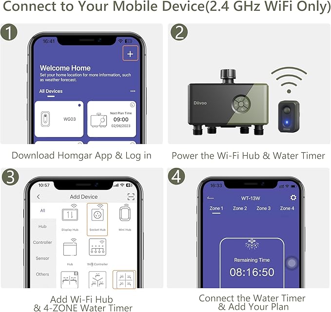 • Remote and Voice Control: With the HomGar app, you can add your Diivoo smart water timer to your WiFi gateway (only supports 2.4 GHz WiFi). Diivoo smart 4 zone hose timer is compatible with Alexa and Google Assistant to make your life easier by simplifying your irrigation efforts