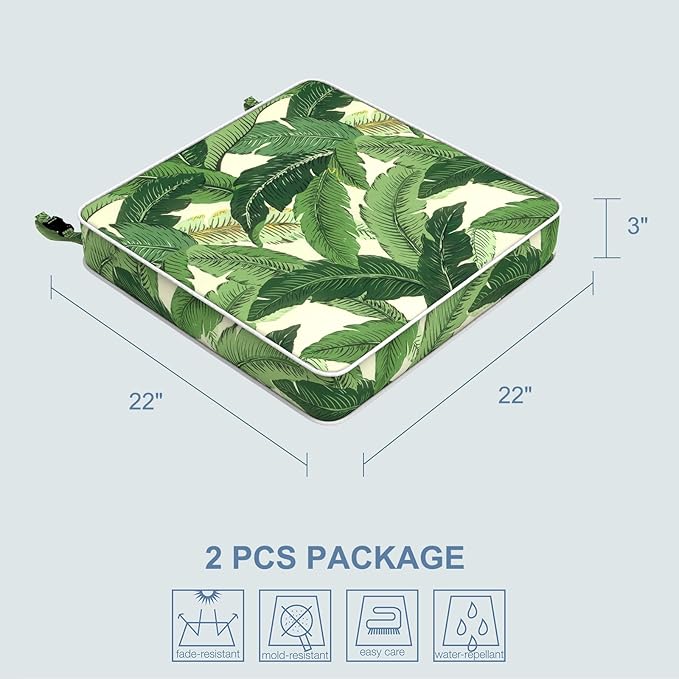 • PACKAGING: Includes 2-Pack outdoor chair cushions 22" x 22" x 3", perfect for patio chairs, garden sofas and more. Due to the vacuum compressed status, please allow 48 hours to restore thickness after opening the package