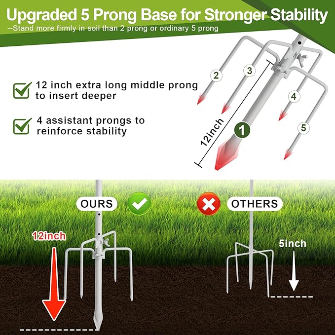 • Upgraded Stability: The hummingbird feeder pole for outdoors features a unique 5-prong base, with a 12-inch extra-long middle prong for deeper soil insertion and four surrounding prongs to reinforce stability, ensuring this hummingbird pole stands firm even in softer ground