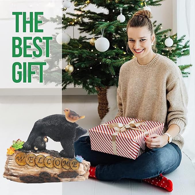 • 【Bear Garden Decorations】: bear resin statue equipped with LED solar lights. cute bear sculpture plays on a tree stump with a welcome sign and flowers on it. As night falls, the welcome sign and a little bird on the bear's back sparkle. The decoration of Sun Bear Garden will definitely add a touch of creativity to your home, suitable for decorating porch, garden, lawn, office desk, etc.
