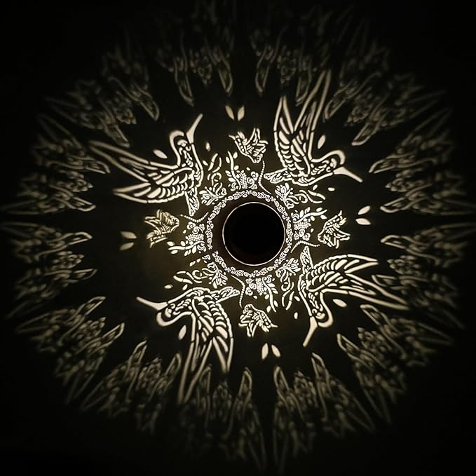• 【Hummingbird Garden Decoration】The solar outdoor lantern is inspired by animal elements in nature. It projects bright hummingbird patterns in the dark, creating a gorgeous and warm atmosphere and bringing vitality and fun to your garden. It adopts a gold-copper color and hollowed-out metal finish, presenting a retro look.