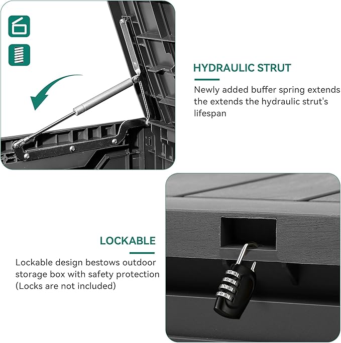 • Built to Last: Crafted from weather-resistant resin, these outdoor deck boxes are waterproof, rust-proof, UV-resistant, and fade-proof, making them ideal for long-term outdoor use in various climate conditions