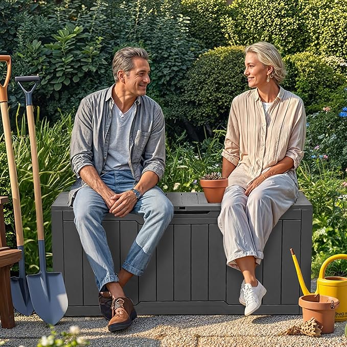 • Extra Seating: Doubling as a comfortable bench seat, this plastic deck box can support up to 485 pounds; Set it up in just 15-30 minutes, and enjoy its unique wood-grain texture that seamlessly blends with any patio or deck decor in no time
