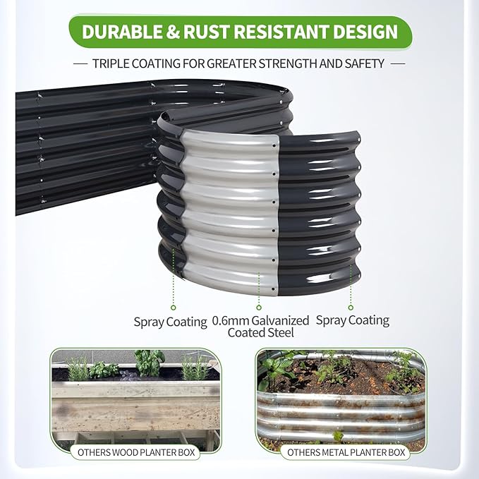 • 【Upgrade Quality & Structure 】The raised garden bed is made of thick galvanized metal with a surface spray coating, which is rust proof and anti-corrosion. Can be used for a long time. The oval design ensures uniform surface force and prevents deformation. More durable than other raised planter box, becoming a good helper for your garden.