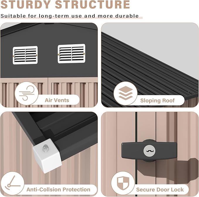 • SLOPED ROOF & LOCKABLE DOOR & AIR VENTS - The sloped roof is designed to let rainwater flow out quickly. The lockable doors can enhance security and prevent strangers or small animals from entering accidentally. The design of air vents can effectively improve air circulation and prevent your items from getting moldy and damaged in humid and hot summers. Plastic protective caps are provided for the sharp corners of the ceiling and each screw to prevent injuries during construction or use