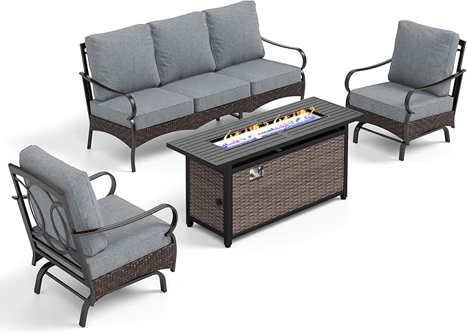 PHI VILLA Patio Furniture Set with 56" Fire Pit Table, Premium Outdoor Wicker Metal Frame Furniture with Upgraded Waterproof Thick Cushions for Porch, Poolside, Deck, and Yard (4 Pieces,Grey