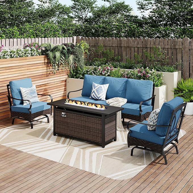 Patio Furniture Set with 56" Fire Pit Table, Premium Outdoor Wicker Metal Frame Furniture with Upgraded Waterproof Thick Cushions for Porch, Poolside, Deck, and Yard (4 Pieces,Navy