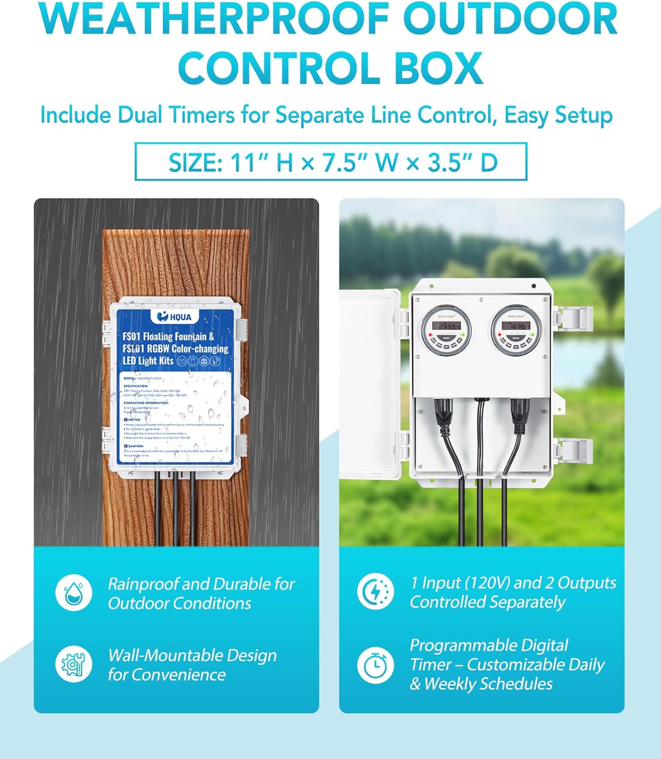 • RGB Color-changing Led light sets included, 4 lights, remote control, 100ft control distance, up to 13 modes. Two digital timers included in the control panel, control the lights and the fountain separately.
