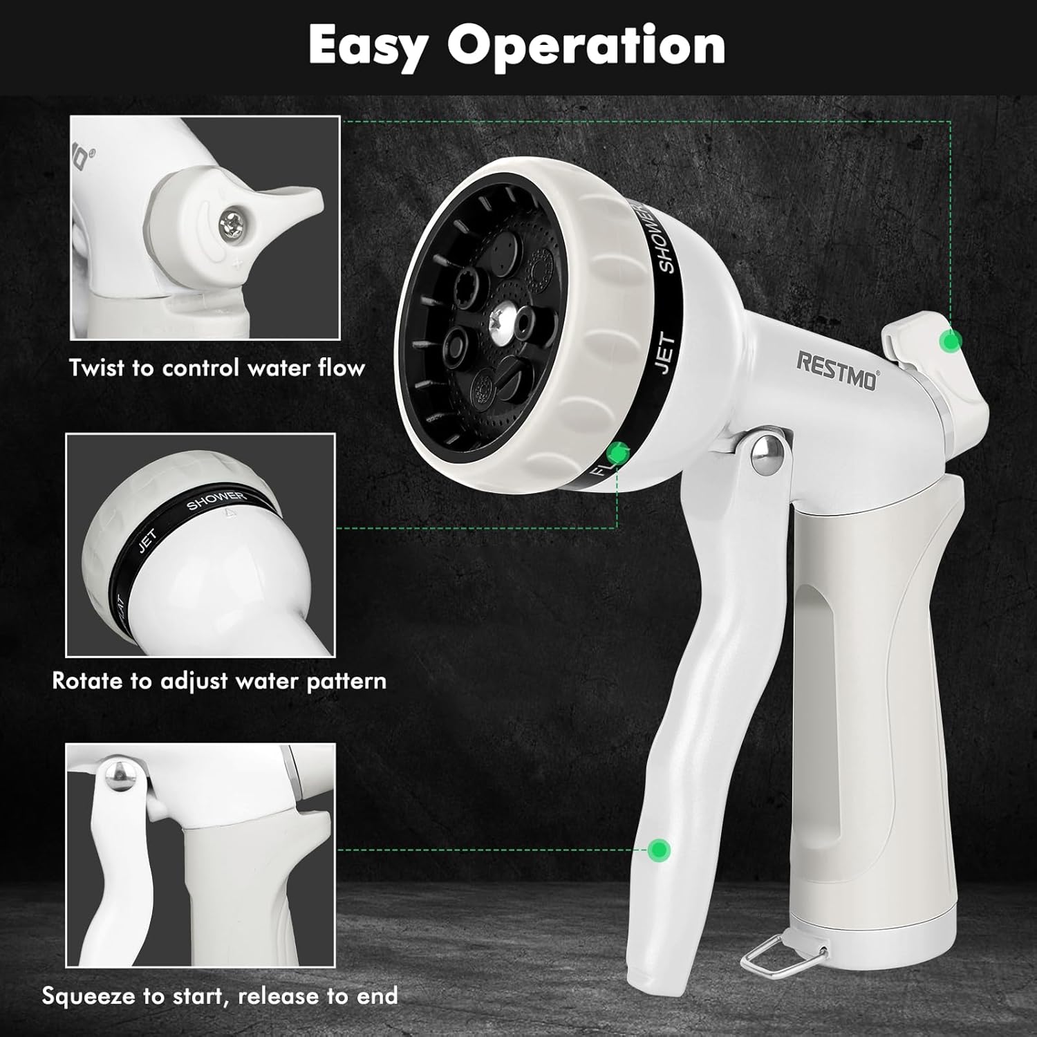 RESTMO Garden Hose Nozzle, Heavy Duty Metal Water Hose Nozzle with 7 Adjustable Spray Patterns, High Pressure Hand Sprayer with Flow Control, Best for Watering Plant & Lawn, Washing Car & Pet, White