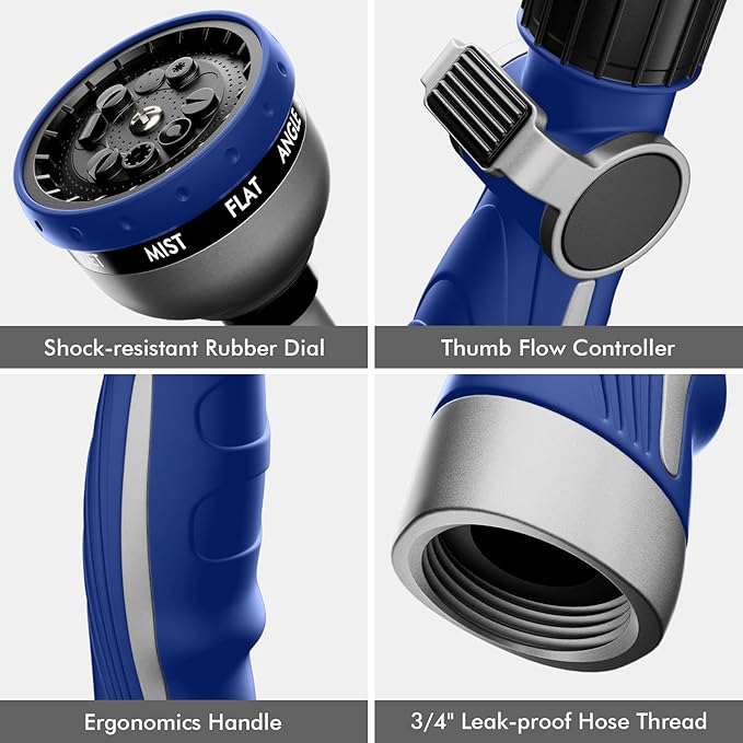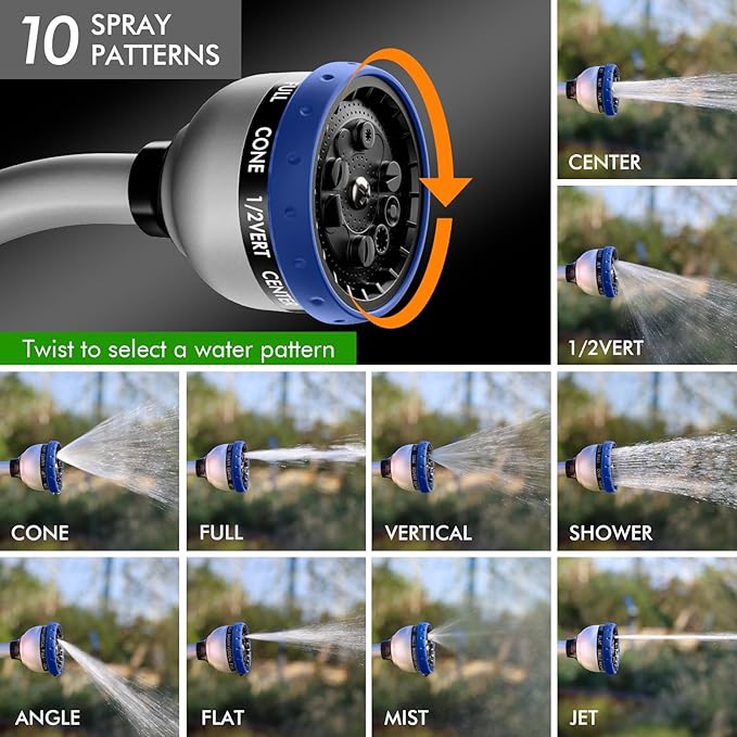 • 【10 Watering Patterns】Rotate the spray head dial to select a water pattern from Shower, Flat, Full, Mist, Jet, Center, Cone, Angle, Vertical, and ½ Vertical. Whether you need the high-pressure jet to clean your window, the useful angle to wash your car, the gentle shower to clean your shrubs, or the soft mist to water your hanging baskets, the 10 patterns have you all covered.