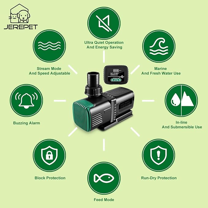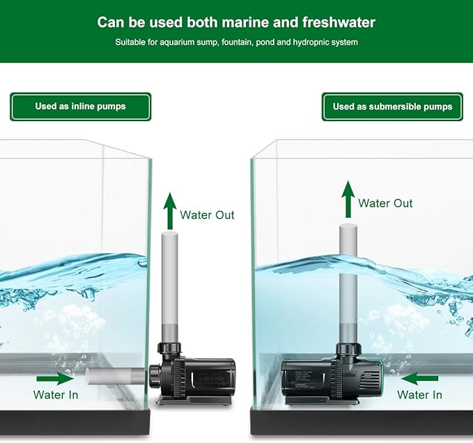 • Wide applicaion DC pump: can be used as salt water or fresh water aquarium sump pump, fountain pump,hydroponics pump and waterfall pump;can be used as external/inline or sumbersible pump;