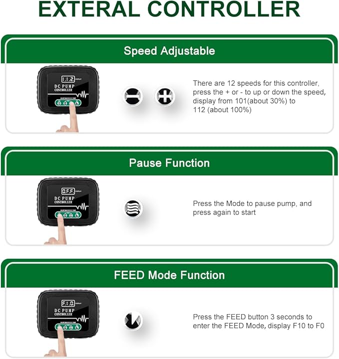 • DC 36V Large Controllable water pump:12 speed adjustable,control the flow from 30% to 100% of max flow,with 10 minutes feeding mode;