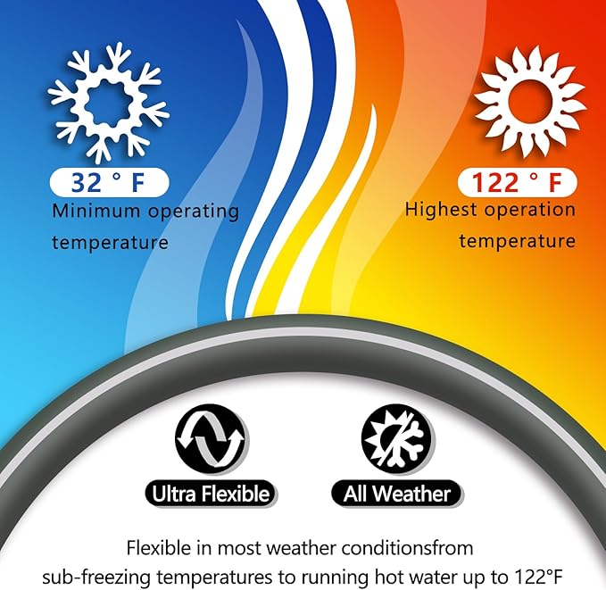 • Defying the Elements, Suitable for All-weather: Don't let extreme temperatures hold you back! Our garden hose is engineered to conquer the heat of summer and the chill of winter. Its low/high temperature resistance ensures that it remains flexible, reliable, and ready to perform, no matter what Mother Nature throws your way.