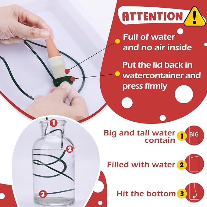 • 🌳SELF WATERING PLANTERS INSERT: Save your time and your plants.Soak the clay cone at least 15mins,put the lid back in water container and press firmly. Create a vacuum environment by ensuring the green pipe is full of water and no air inside,put the hose into the container and insert this stake into the soil,it’s started to work for your plants. Set up easily.