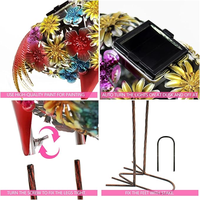 • Perfect Outdoor Yard Ornaments: Suitable for outdoor use, with the waterproof rating of IP44 and weatherproof, no worries about rain, snow, frost, or sleet. It is a great Mothers Day gift for mom. Our solar yard ornament can be placed in the backyard, sidewalk, around your patio or front porch, fountain, a great decoration for wedding, shop window, flamingo theme party supplies.Also a unique gift giving to housewarming, holiday and a birthday for a hostess