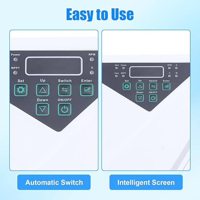 • 【MPPT Controller】The solar water pump controller drives a highly efficient brushless DC water pump motor that utilizes the latest MPPT technology to ensure maximum flow in all light conditions. Protect the submersible pump from frequent start-up, overheating, and dry operation under low light conditions.