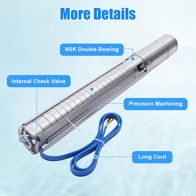 • 【Safety Protection】It has an intelligent water shortage protection function, when there is no water in the well, the pump will stop working automatically and start working automatically after 15-30 minutes. There are also protection functions such as over-voltage, under-voltage, over-current, phase-loss, and high-temperature protection.