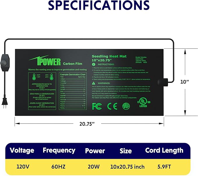 • Specifications: size: 10 X 20.75 inch; voltage: 120V; frequency: 60Hz; power: 20W. Package Included: 1 pack seedling heat mat with temperature adjustable knob