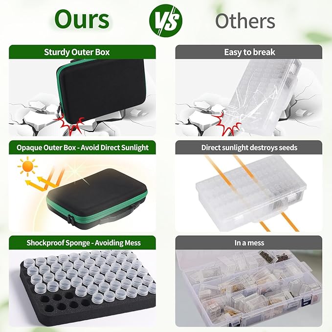 • Portable & Sturdy Carry Case: This portable seed saving box is made of high-quality EVA material which is water-resistant and very sturdy for long use. There is a convenient carrying handle so you can take the box with you wherever you go. A mesh pocket is perfect for managing all accessories and tools, and a double zipper is designed for more casual use. Keep all your seeds and seed supplies in one bag with the internal shockproof sponge.