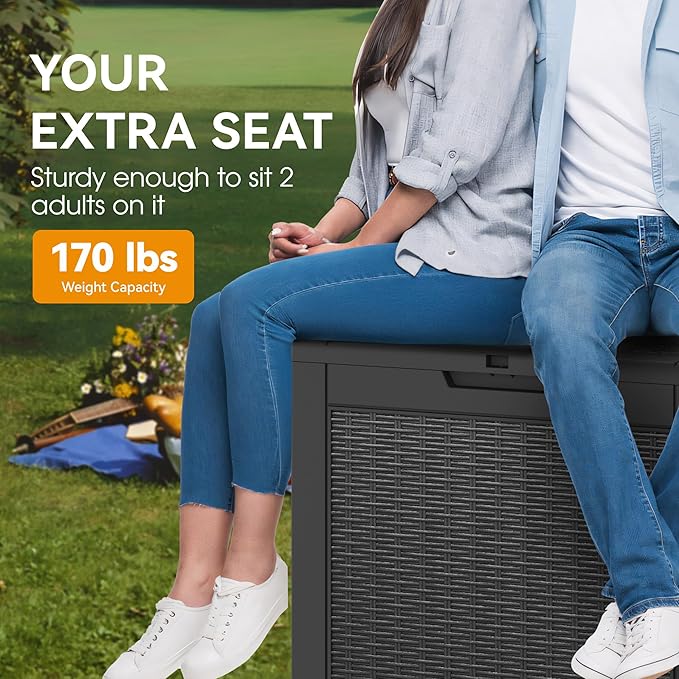 • 🏕️【HIGH QUALITY MATERIAL】This outdoor storage bin is made of high-density PP resin with excellent waterproof, sunproof and dustproof performance to withstand all kinds of harsh weather, while the rattan-like texture surface design adds a modern touch to your outdoor space.