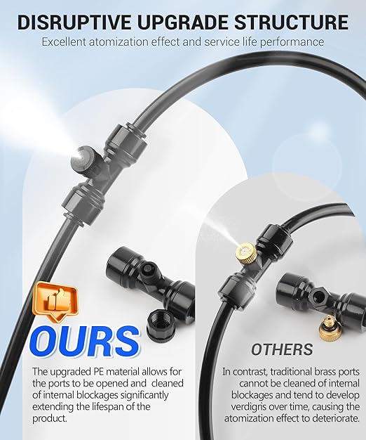• 【High-Quality Misters for Outside Patio】The upgraded PE material allows for the ports to be opened and cleaned of internal blockages, and PE material ensures that the misting cooling system is resistant to corrosion, leakage, and sediment blockage caused by weather and usage conditions, giving the misting system the advantage of a long service life