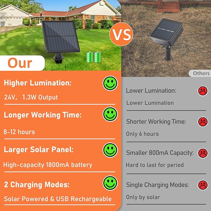 • 【Easy installation & Widely Used】Our solar powered string lights can be placed anywhere, either stuck into the ground or fixed to a wall. Designed with easy-to-install cup hooks on each bulb, these LED outdoor string lights are incredibly flexible and practical, making them perfect for a variety of spaces such as patios, backyards, decks, bistros, cafes, pergolas, gardens, markets, and more. Please feel free to reach us at any time if you have any problems or require assistance.