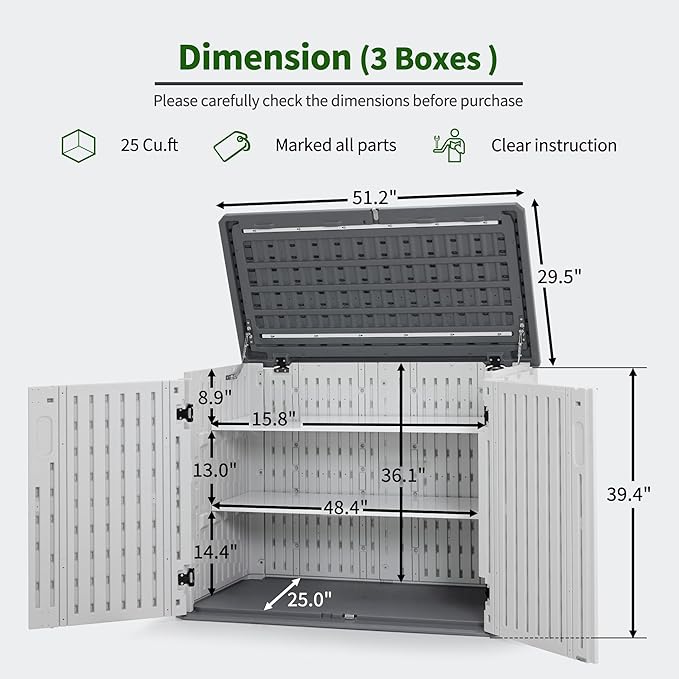• Plastic Shed: Overall Dimension: 52.16 (W) x 28.34 (D) x 38.58 (H) inch; Internal Dimension: 48.43 (W) x 25.00 (D) x 36.10 (H) inch