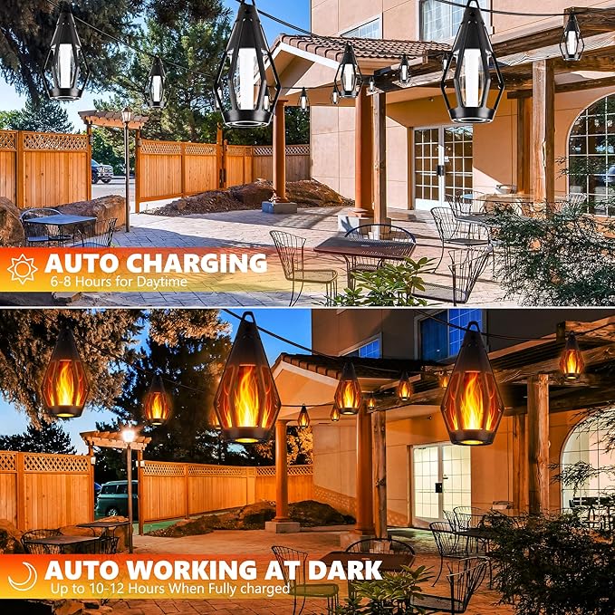 • Warm White Flame Design: Create a cozy atmosphere with our solar-powered flame string lights, perfect for enhancing the ambiance of your garden, patio, or outdoor events.