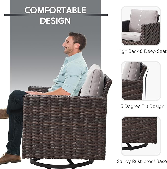 • 360°SWIVEL & SMOOTH GLIDER - Our patio furniture set swivel chairs features a unique combination of 360° swivel and front and back glide for you to enjoy the outdoors. The base is fitted with a high-strength, rust-resistant frame for extra stability and support. Whether you're gathering with friends or enjoying the scenery alone, the swivel and glide features make it easy to find the perfect viewing angle