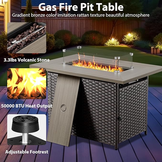 • 50,000 BTU 43" Fire Pit Table - Uses liquid propane fuel (Requires additional purchase) for steady, clean combustion, generating up to 50,000 BTU of heat, so there is no ash or smoke. The pure hand-woven PE rattan appearance looks more beautiful and luxurious, and is dirt-resistant and easy to clean, which can perfectly match the appearance of the entire set of furniture