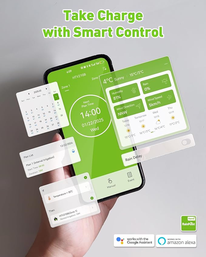 • 【Make Irrigation Easier】The seasonal adjustment feature automatically adjusts the watering duration by the percentage you set (10%-200%) each month, eliminating the need for you to repeatedly adjust your schedule. Smart water timer is compatible with Alexa and Google Assistant for hands-free operation via voice commands.