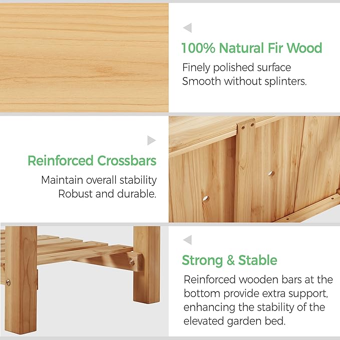 • Solid Fir Wood: The raised garden bed is made of non-painted fir wood, known for its strength and stability. The thick solid boards are polished with smooth surfaces and no burrs or wood splinters