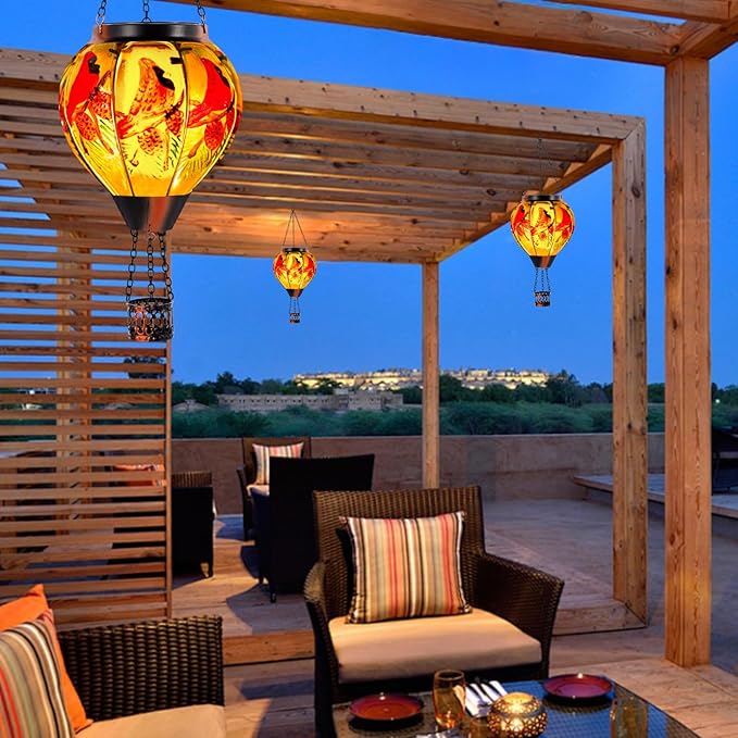 • 【Solar-Powered】Outdoor solar lanterns absorb sunlight during the day and automatically light up at night, providing 6-8 hours of lighting. The soft and warm light of hot air balloon solar lantern creates a romantic and peaceful atmosphere for the outdoor space.