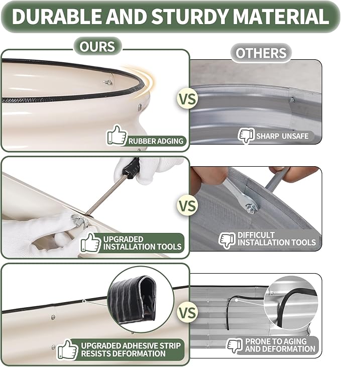 • 【High-Quality Materials & Durable】 Made from 0.7mm metal panels with double-layer anti-corrosion, this outdoor raised garden bed features a robust oval-shaped design for added strength and durability. Resistant to rust and corrosion, it provides a long-lasting gardening solution that can be reused for many years, ensuring a sustainable and reliable space for your plants to thrive