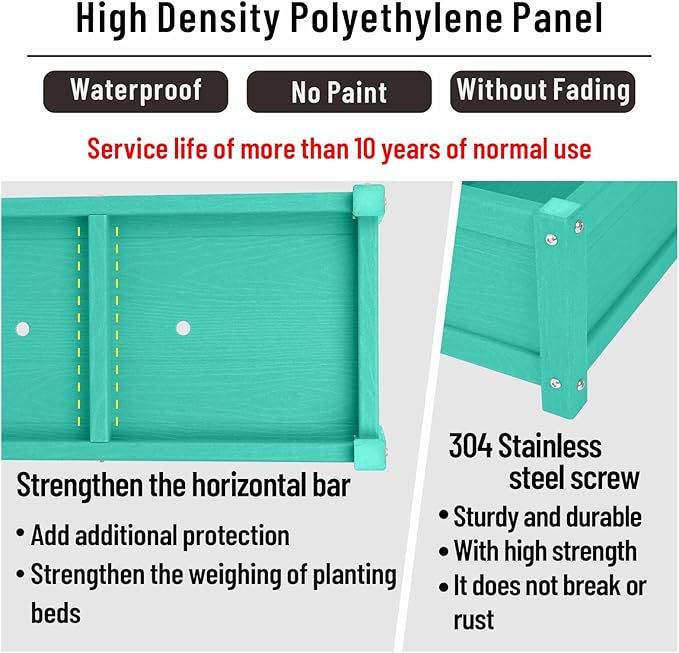 • Safety:Raised planter box outdoor made from HDPE,with no water or oil-based coatings, ensuring that your fruits, vegetables, plants, and herbs grow safely