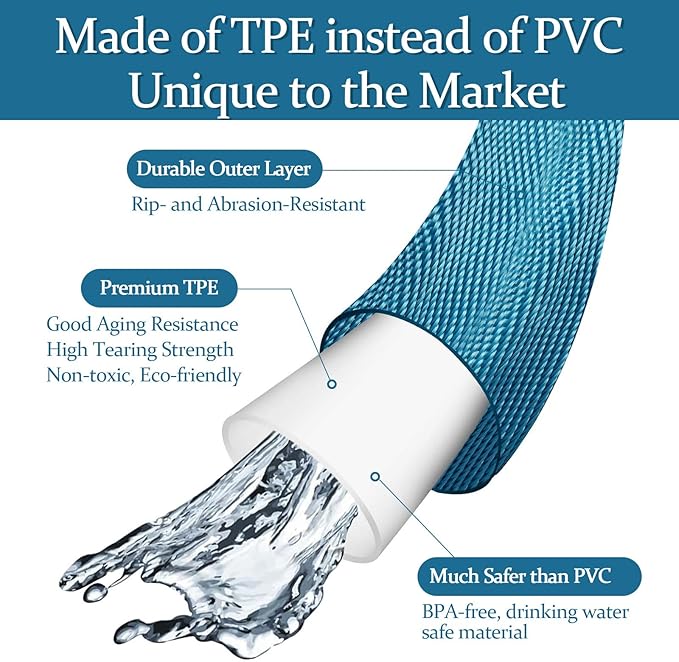 • [ All-Weather Flexibility ] Maintains flexibility down to -22 degrees Fahrenheit and can be used in temperatures up to 150 degrees Fahrenheit. Ordinary PVC hose has poor-resistance to low and high temperatures, and the hose loses performance under temperature changes, which can damage it. TPE's superior freeze-resistance provides durability to the hose.