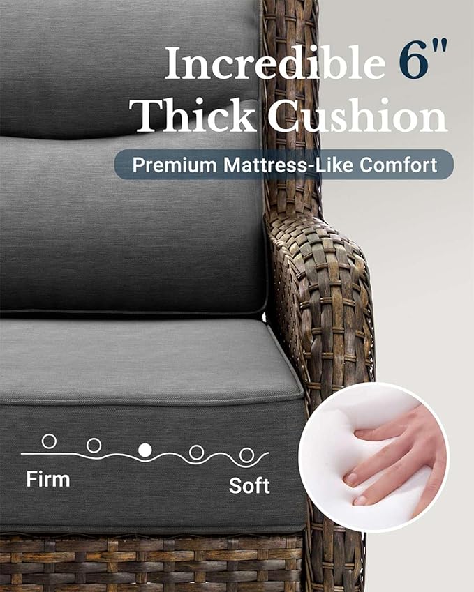 • 6-Inch Extra Thick Seat Cushion: Each cushion of our patio swivel chair and sofa is made of 6-Inch thick, 28D high-density foam—up to 40% more cushioning depth, 30% better bounce-back and 2x the durability than 4-Inch of most outdoor sets. Sit back, feel the lasting difference
