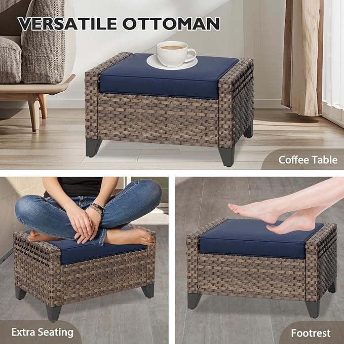 • STYLISH WICKER: This 4 piece rattan furniture set, includes 2 sturdy armrest chairs and matching ottomans, that provide support for you neck, back arms and legs. Tramsform your garden, balcony, deck, patio, porch, sunroom, yard or poolside oasis with this outdoor furniture set.