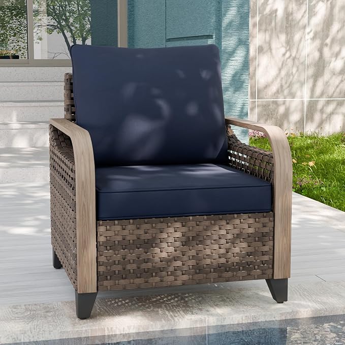 EAGLE PEAK Modern Wicker Outdoor Chair, Patio Chair Curved Armrest, Rattan Patio Furniture for Yard Deck Porch Garden, 1 Chair, Brown/Blue
