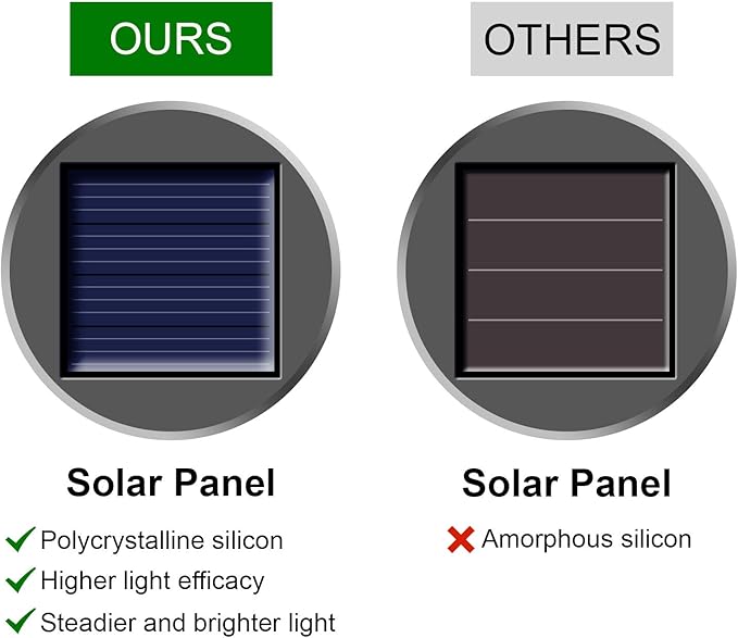 • Better Solar Panel: Unlike other outside solar hanging light panels made of Amorphous silicon, Our solar lights are made of Polycrystalline silicon which has higher light efficacy. With the same charging hours, our solar panels can save more electricity in the daytime and casts brighter and steadier glow at night.