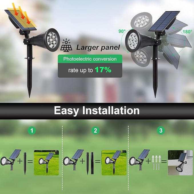 • 270° Sun-Chasing Flexibility: Tilt the waterproof solar panel 180° for maximum charging, then angle the LED head 90° to colorful spotlight your flagpole or wash light over garden sculptures.