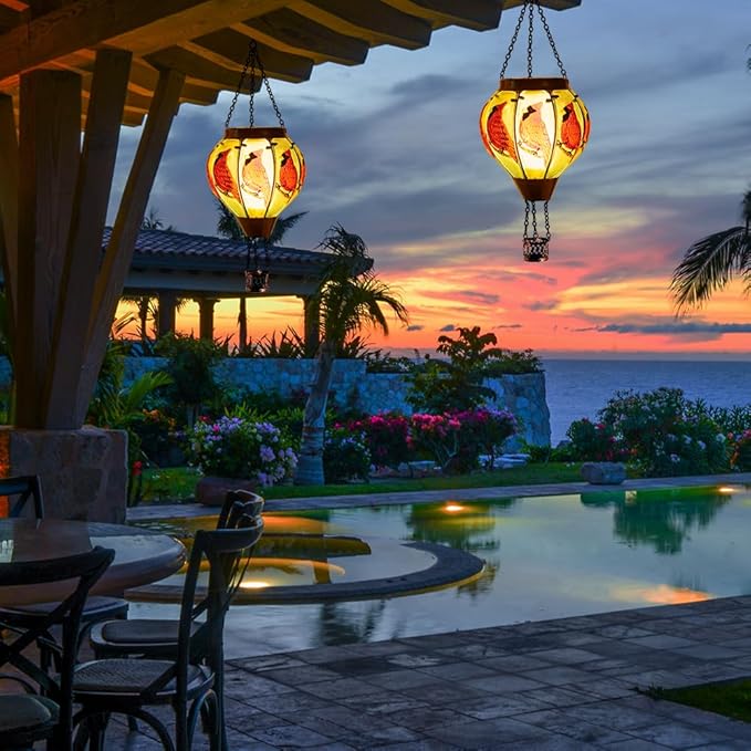 • 【Cardinal Hot Air Balloon Solar Lantern】These outdoor hanging solar lanterns alternates between blue and green glass, adorned with red cardinals, creating a captivating display. When the solar lantern is lit, they mimic a rising hot air balloon with a flickering flame, creating a beautiful effect and symbolizing warmth and good wishes.